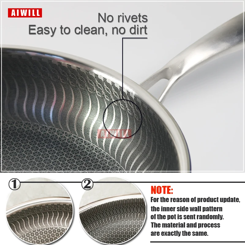 NOTE: AIWILL cookware products are marked with outer diameter as the standard, and they are all manually measured. Because this frying pan has a crimping design, the outer diameter and inner diameter are different. About 2cm, for example, the outer diameter is 28cm, then the inner diameter is about 26cm.